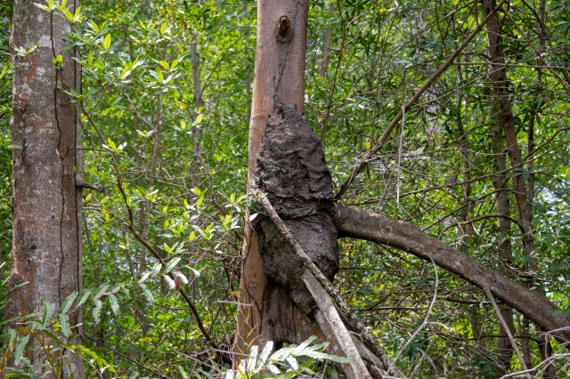 Huge termite nest built on the side of the tree.