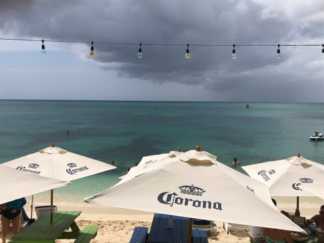 Although the tour of the day was over – it seemed imperative that a bit of the local scene was experienced on Seven Mile Beach before the Marina was boarded for the last time. So – we were off to find some beach front property to chill on and have a bite of lunch. Calico Jacks was just the place – –