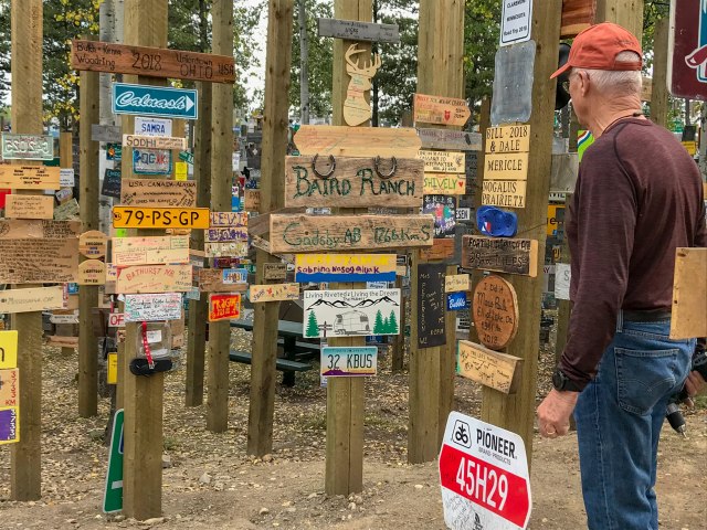 Now well along the Al-Can, another 370 miles took us to Watson Lake at mile 635 – AND the sign post forrest. In 1942 a homesick GI working on the Alaska Highway erected a sign stating the mileage to his home town. This one sign grew to a ‘forrest’ and we wanted to be a part of it;-)