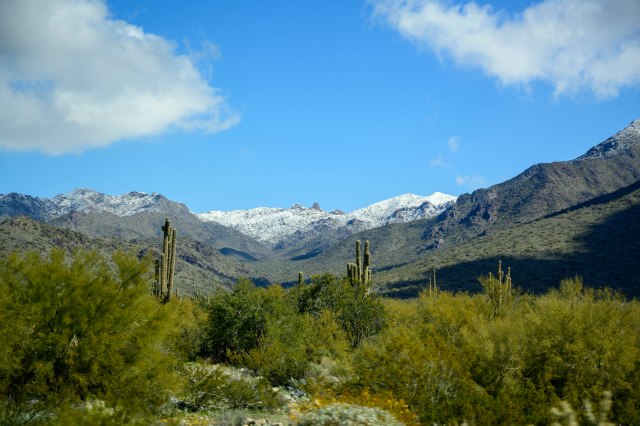 Then the surprise of all surprises!!  All that weird weather this year provided a sight rarely seen in the Valley of the Sun – – SNOW on the McDowell Moutains.  With the entire valley encircled by snow capped mountains, we thought we were back in Salt Lake City;-)