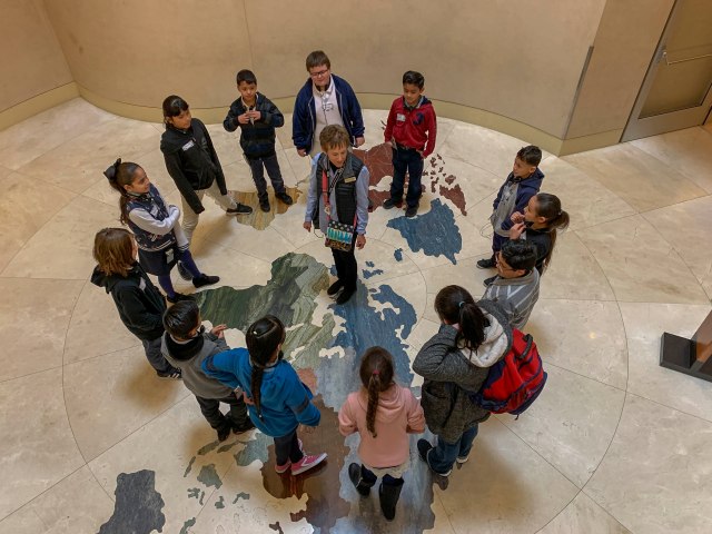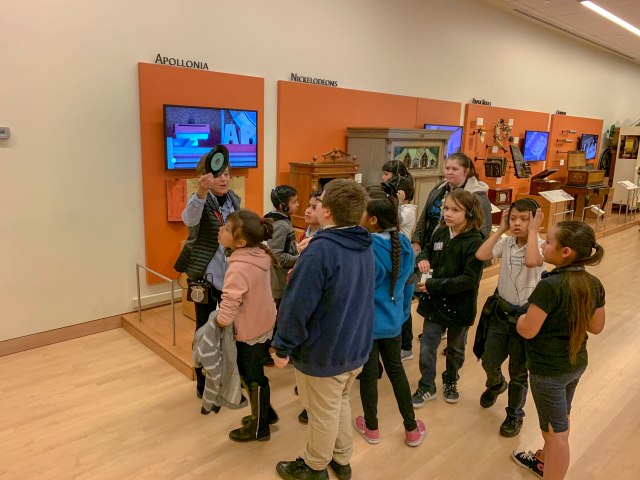 Elizabeth guiding a group of third graders around MIM