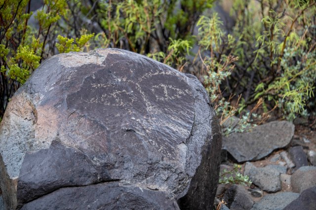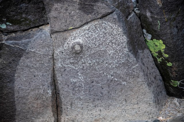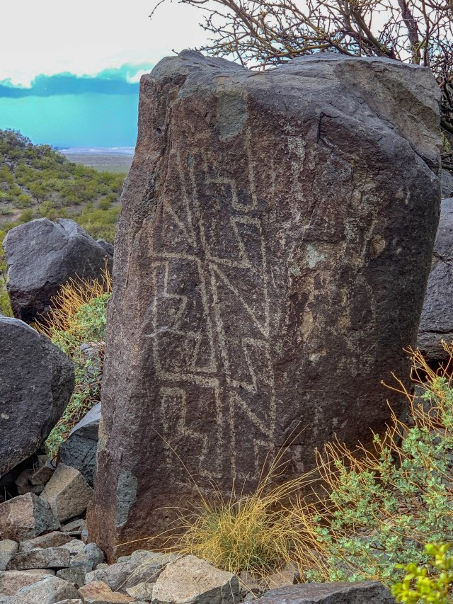 Morning came fast and it was a cold, rainy day. BUT – we had sights to see. So, off to the Three Rivers Petroglyph Site just east of White Sands Missile Range in the Tularosa Basin. This Basin has been inhabited by humans for 10,000 years or more. The past residents left traces of their ways of life, including petroglyphs, pottery, stone tools and village ruins. The Three Rivers Petroglyph Site includes some of the more than 20,000 petroglyphs identified in the area left by inhabitants of a nearby village. Those people were of the Jornada Mogollon prehistoric Indian culture, of which there are no known modern descendants. Their rock carvings were created over 600 years ago. The meaning of these carvings are not known – but they are still quite interesting.
