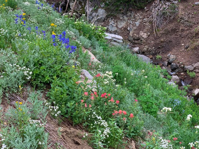 Catherine’s Pass was so beautiful a few days before, perhaps we should go back to Alta and try Cecret Lake in the same area.  Unfortunately, there had been a really bad storm the night before that knocked all the flowers off their stems AND created pretty bad mud slides.  Fortunately, the slides on the roads were cleared so we could get to the trailhead – but the carpet of flowers were gone;-(