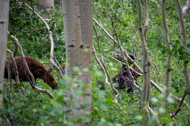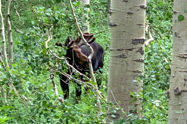 One of the really FUN things is to take “the back way” home from Sundance – passing through a lot of moose territory.  Sure enough, we were lucky this day.  There was a whole family – Mom, Dad and a calf:-)  Doesn’t get any better than that!!