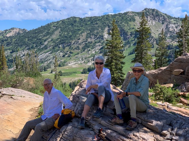 Since Larry and Jane were only here a few days – there was no rest for the weary.  So, the next day we were off to Alta to hike Catherine’s Pass – another fave, especially when all the wildflowers are in bloom.  Nothing is more beautiful than that carpet of yellow and blue and the sight of Catherine’s Lake when one reaches the saddle – –