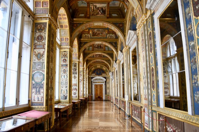 In 1762, Catherine the Great commissioned the Small Hermitage be built, as there was not enough room in the Winter Palace to display all the art she had collected. The Pavilion Hall was a connector, decorated in the French Renaissance style with MUCH gold – –