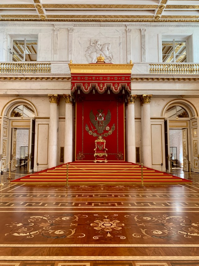 There are actually two throne rooms in the Palace. The ‘Small Throne’ room (above) is to pay homage to Peter the Great and the walls are emblazoned with the double-headed Romanov eagle. The St. George Room – or Large Throne Room – was created in the 1840’s as the setting for official ceremonies and receptions. The magnificent parquet floor is made from 16 types of wood and the design is a mirror image of the gilded ceiling.
