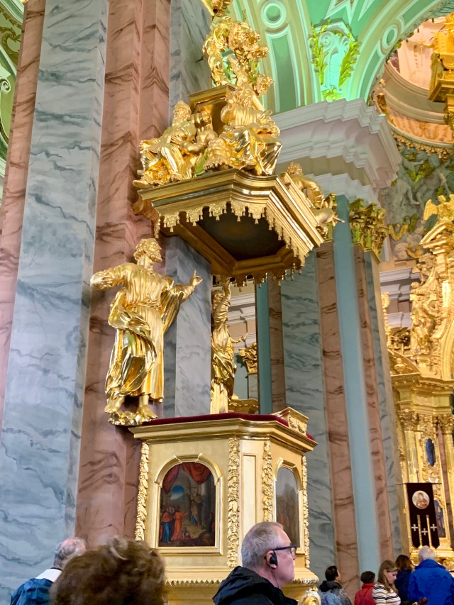 This early 18th century cathedral was designed in Baroque style by a Swiss-Italian architect imported by Peter the Great to introduce European culture to Russia. Therefore, not surprisingly, the interior is NOT typical Russian. Here rests Peter the Great in the lower right corner and Catherine II the Great in the upper left. Elizabeth (ruling between Peter and Catherine) is in the lower left corner.