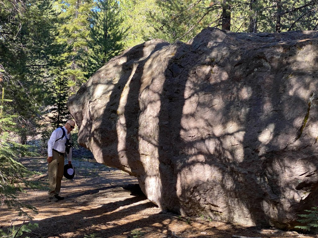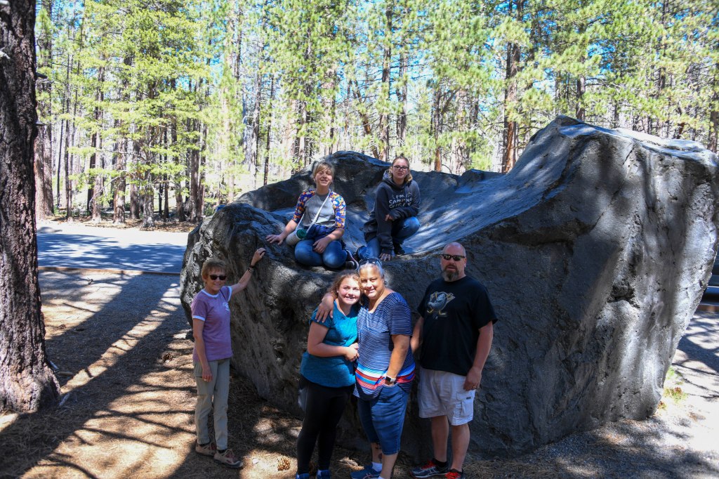 After entering the park from this northwest corner, the first stop was the Loomis Museum and Ranger Station. Here the girls picked up their Junior Ranger activity booklet to learn about the park and earn a badge. (Gramma was sworn in to give the badges once all activities were completed;-)) The Lassen Volcanic Guide was also obtained to to give us hints on activities for our short stay. And we were off to find the Devastated Area and its self guided walk. On the way we passed Hot Rock! This several ton rock was ejected from the crater of Lassen Peak in 1915 and photographed by Mr. Loomis, who reported the rock – “too Hot to touch”;-)