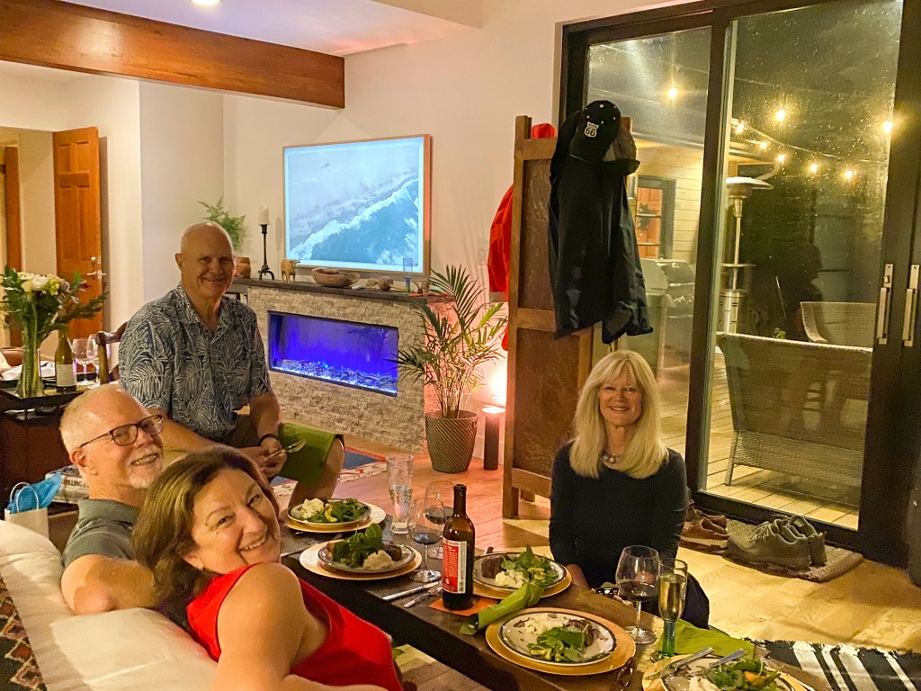 The best part of Park City is all the friends and the time we get to enjoy with them during the summer months. Sally is a hiking, dinner, theater and exploring friend. She has held together quite well for the last year and a half as she has done a major remodel of her house. Last year we had dinner in her bedroom, which was just studs and plywood at the time. This year was to be a nice dinner on her beautiful new deck. Only the rain decided that was not to be. So – the second annual dinner party in her bedroom, this time completed;-)