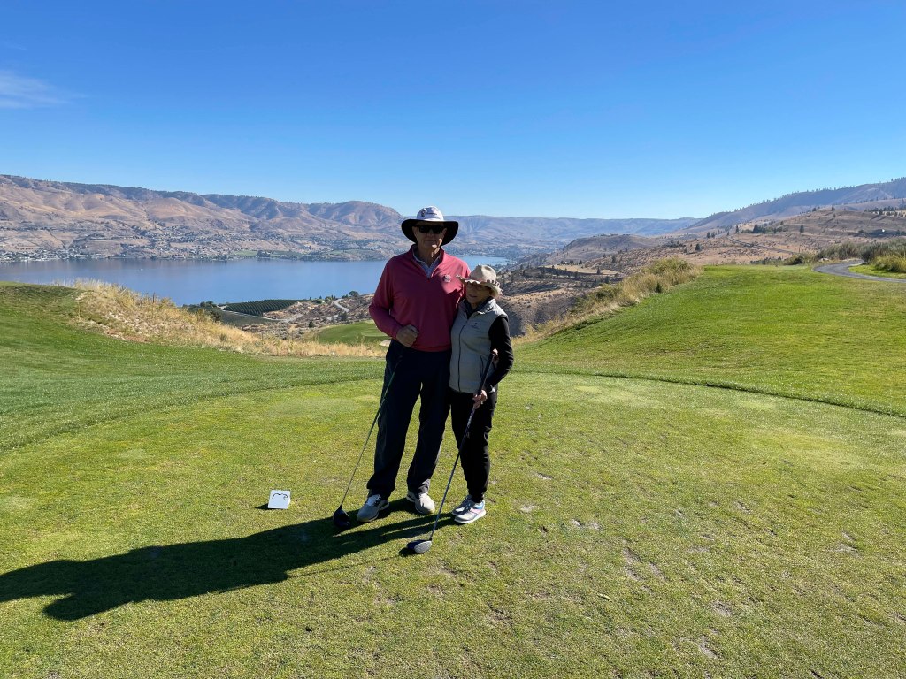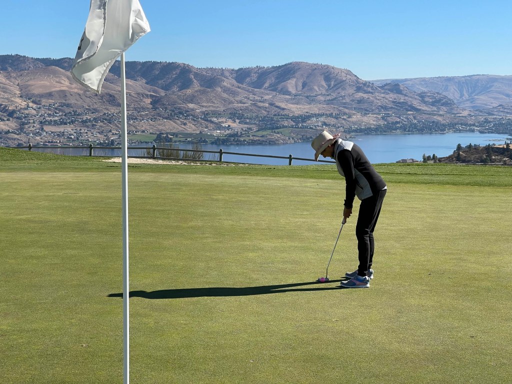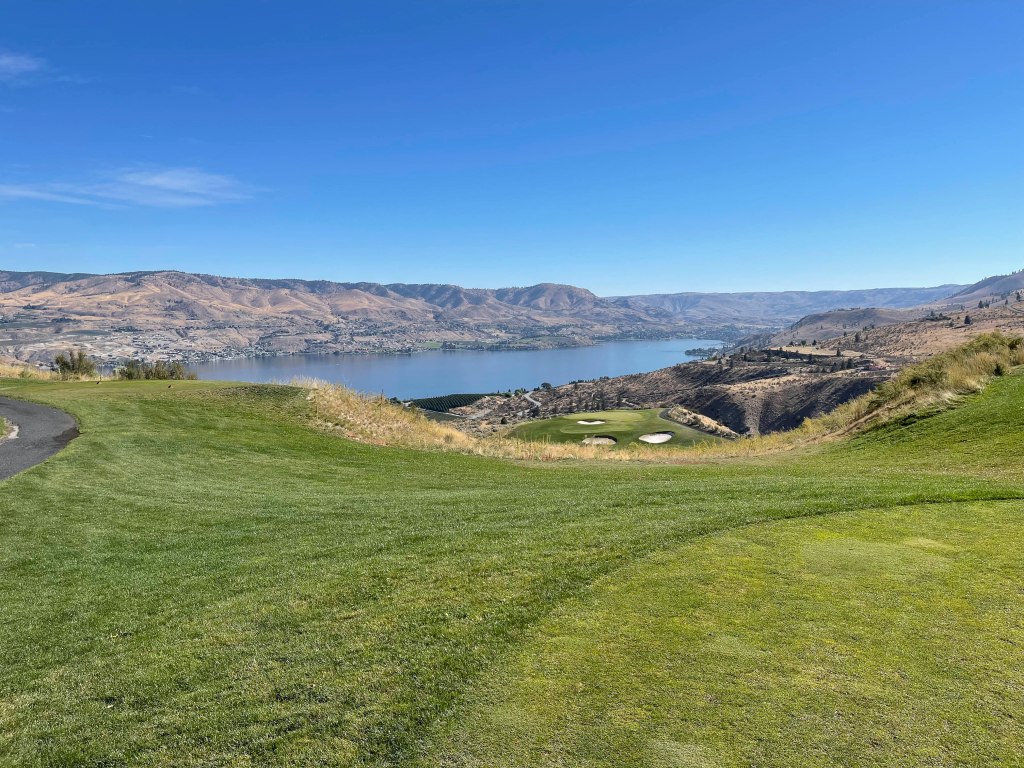 Bear Mountain Ranch was a little closer to town, the weather was better – but the course was MEAN!! It did have beautiful views of Lake Chelan, the apple orchards and vineyards all around – –