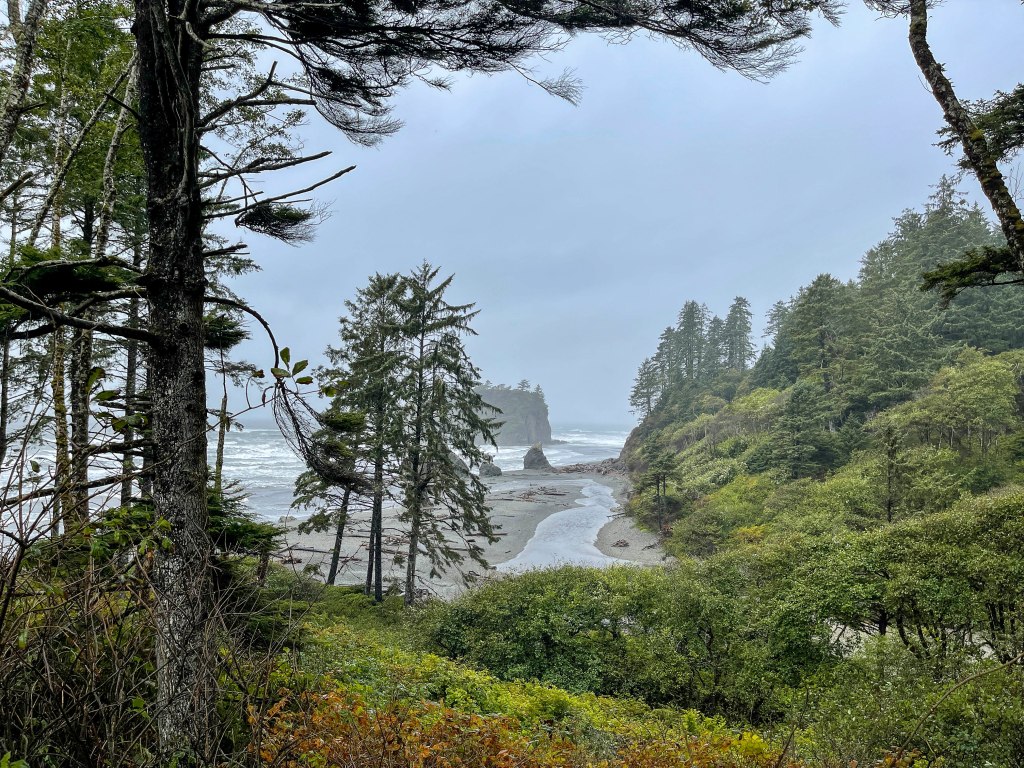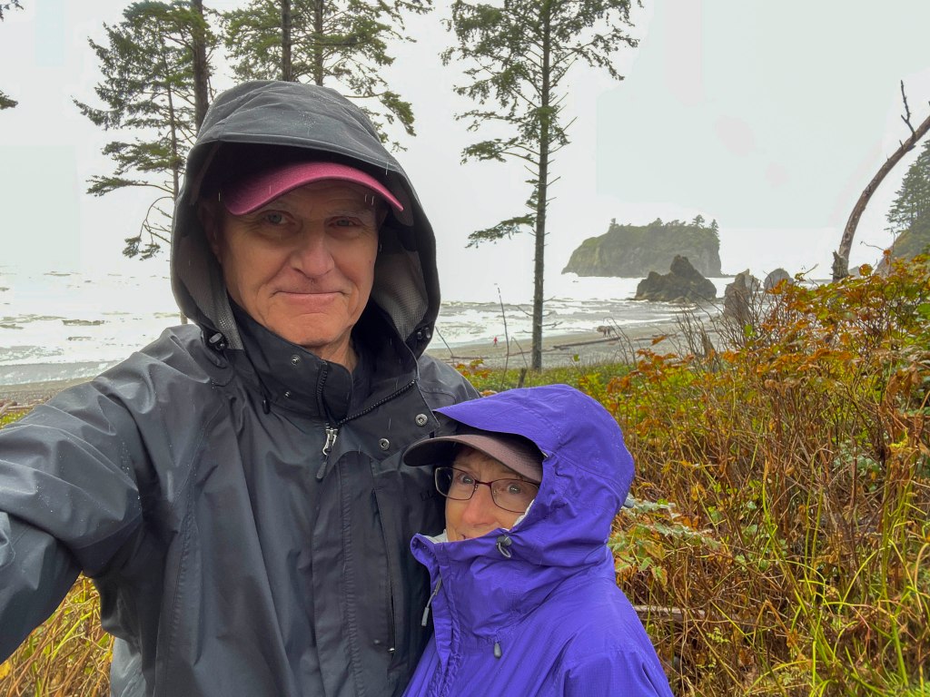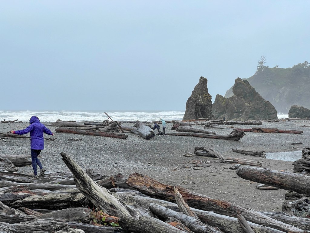 Off to the Rainforests – and BOY did it rain!!! Therefore, there were day car trips instead of hikes. Ruby Beach was quite fun, even in the rain. The sea stacks and rocky beach were something to see and explore – –