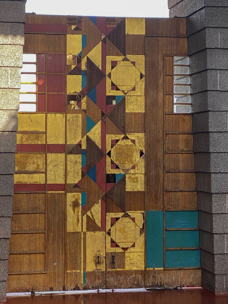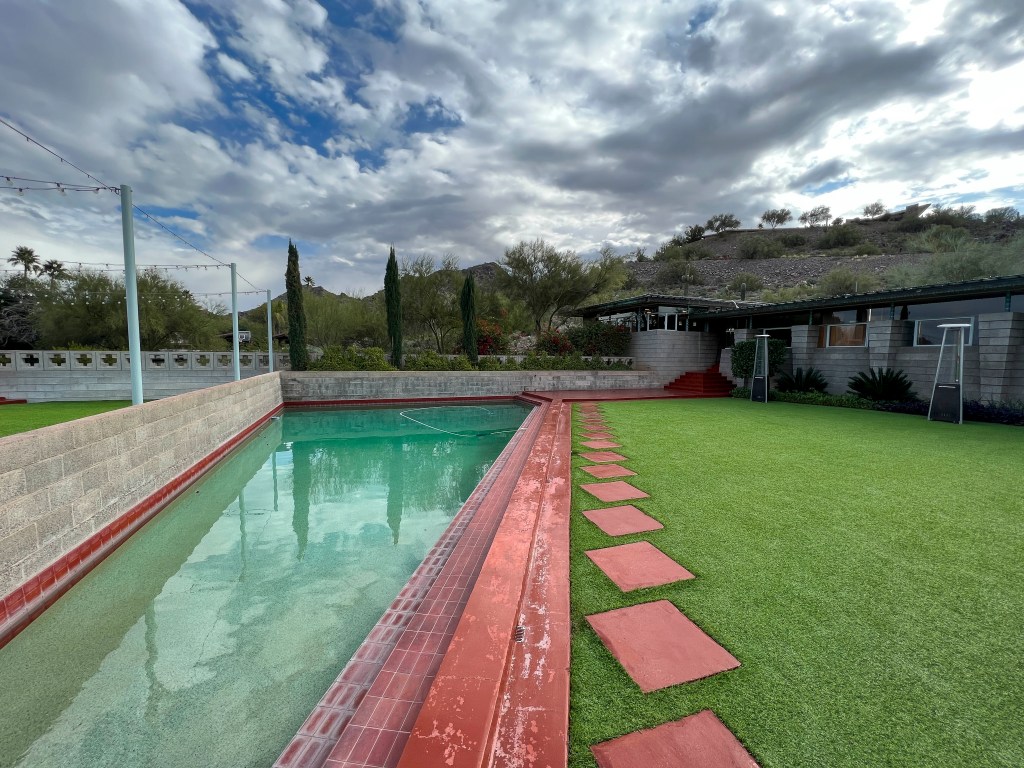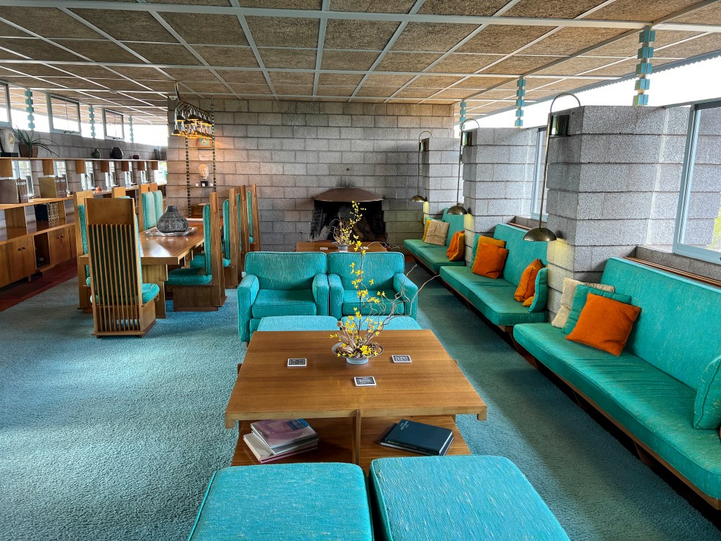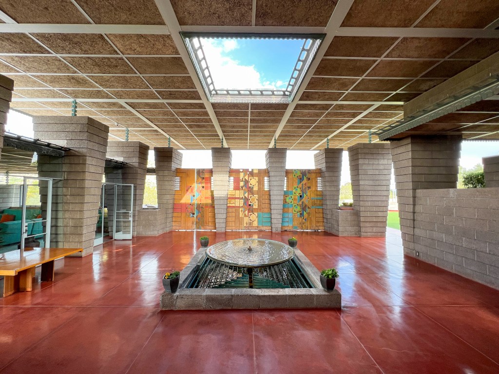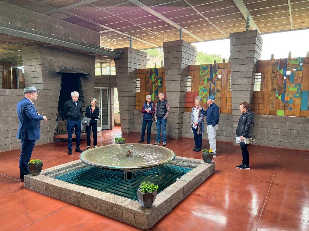 The Holidays are over and it is time to look for a few new activities beyond the Friday hikes, 5 mile walks to Starbucks twice a week, volunteer shifts at MIM, golf twice a week and whatever else is repeated on the calendar. So – the Chihuly exhibit at FLW’s Taliesin West brought to mind a stashed away list of FLW houses in the greater Phoenix area and E’s desire to tour them all. The Harold Price, Sr. house popped out as a home that had tours a few times a month and would be a great Saturday outing for a few of us at Vi. Having a tour time, we set off to see this 7 bedroom house set on a 9-acre plot built by FLW for Harold Price and his wife – mainly to have the grandchildren visit (therefore, referred to as The Grandma House). Following Price’s death in 1964, the estate was sold to U-Haul president, Sam Shoen, who has maintained the house as a private residence (but does allow tours). The house is a typical FLW one level, concrete block structure. It has a wonderful, large open-air atrium, which connects the bedroom wing of the house to the living room and kitchen. A GREAT example of a FLW house and furnishings – especially since it has been so well maintained thru the years.