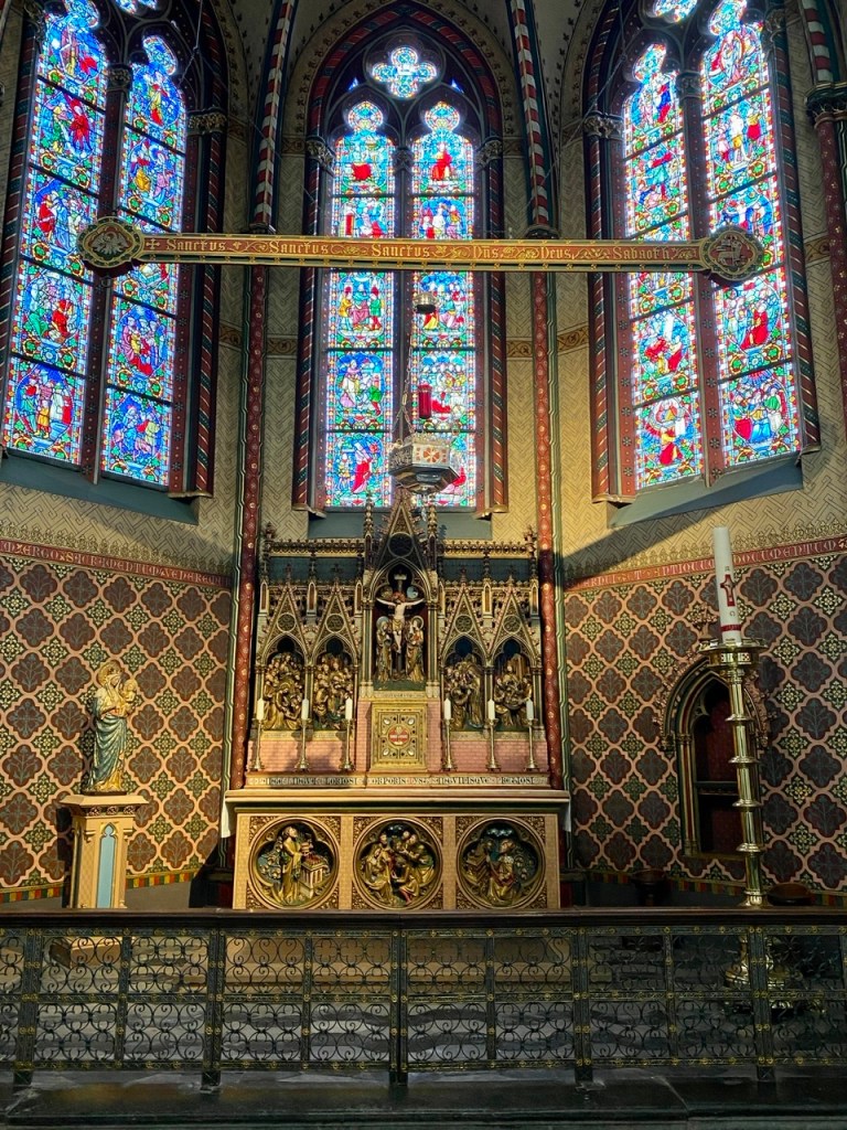 Upon entering the church and standing in the nave, one is surrounded by 12 Gothic-era statues of apostles and views of the medieval-style screen which divides the clergy from the commoners in the nave.