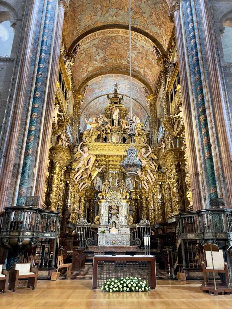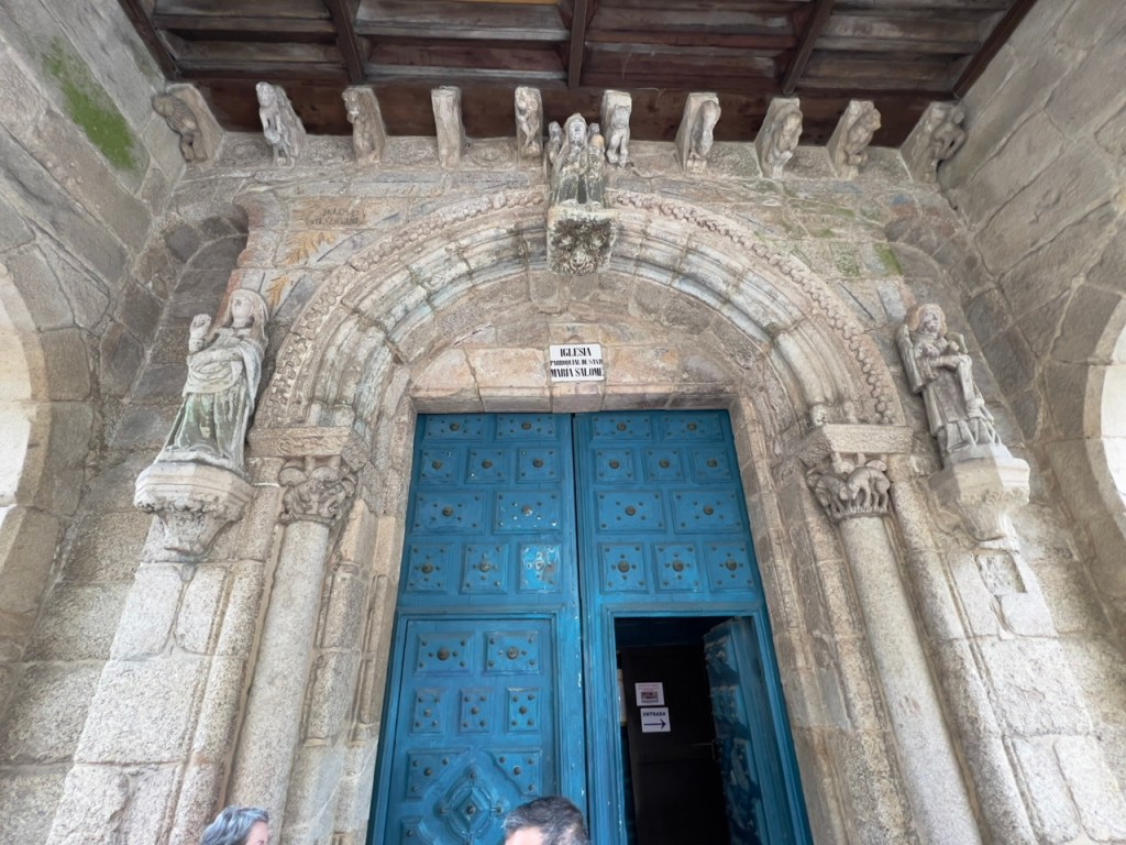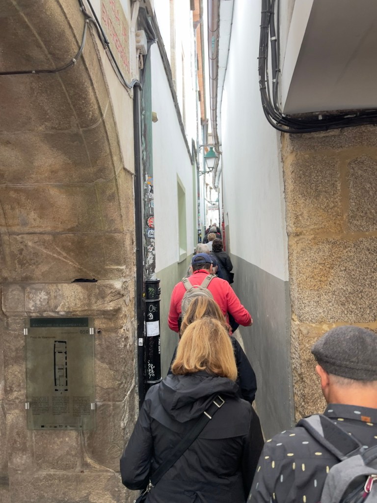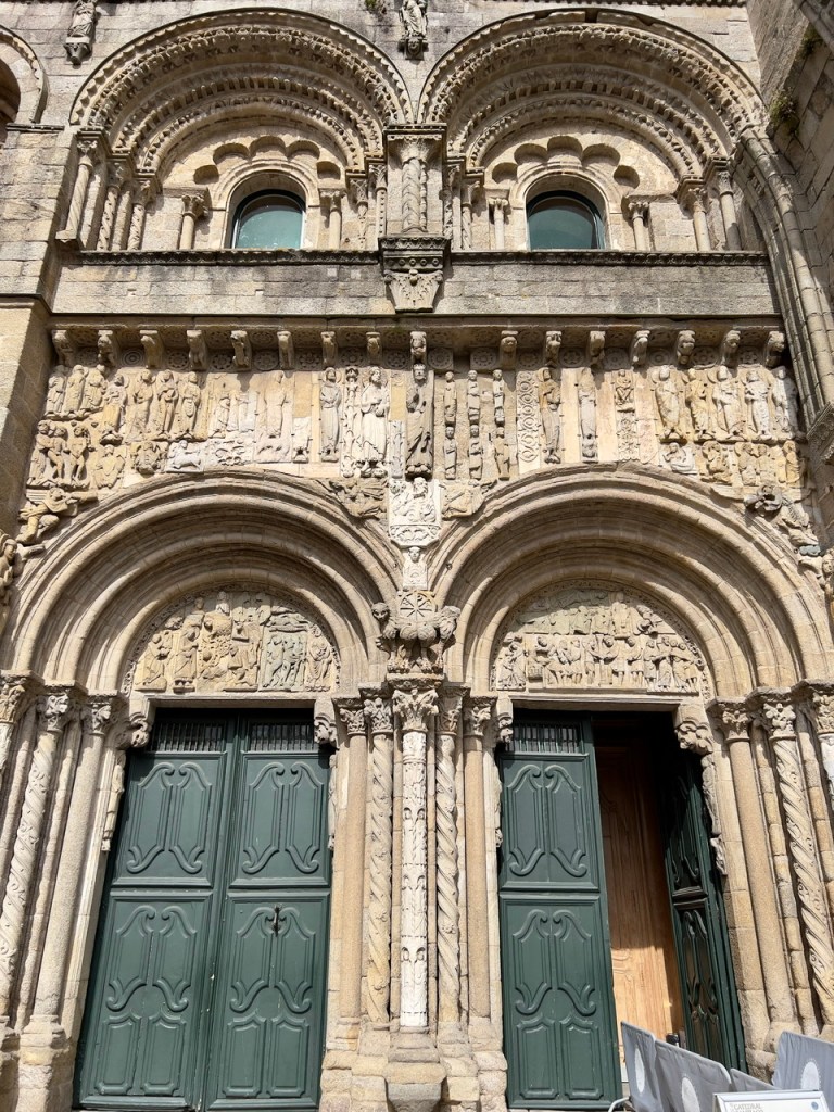 The pilgrims objective after reaching this destination is to enter the cathedral to observe the remains of St. James. AND – if one is lucky enough to arrive to Santiago de Compostela while the ‘Holy Door’ is open, it is an added plus to the experience. The Holy Door is only open in a Holy Year, which occurs when the 25th of July (feast of the Apostle) falls on a Sunday. On December 31st, the Door closes until the next Holy Year (2027). Because of Covid, the Door was not open when the previous requirement occurred but was postponed by the Pope until this year. According to Jacobean tradition, entering thru this special Door will forgive all ones sins. So – through this door we were able to enter!