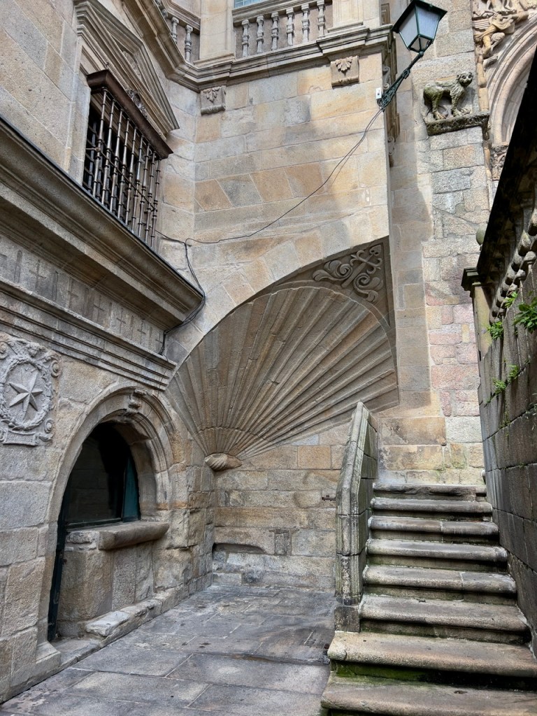 The ‘perfect’ shell is the symbol associated with the church and, therefore, with the Camino. A beautiful specimen is carved into the front entry of the church as are many other symbolic carvings. Remember – these all date back 700 years!