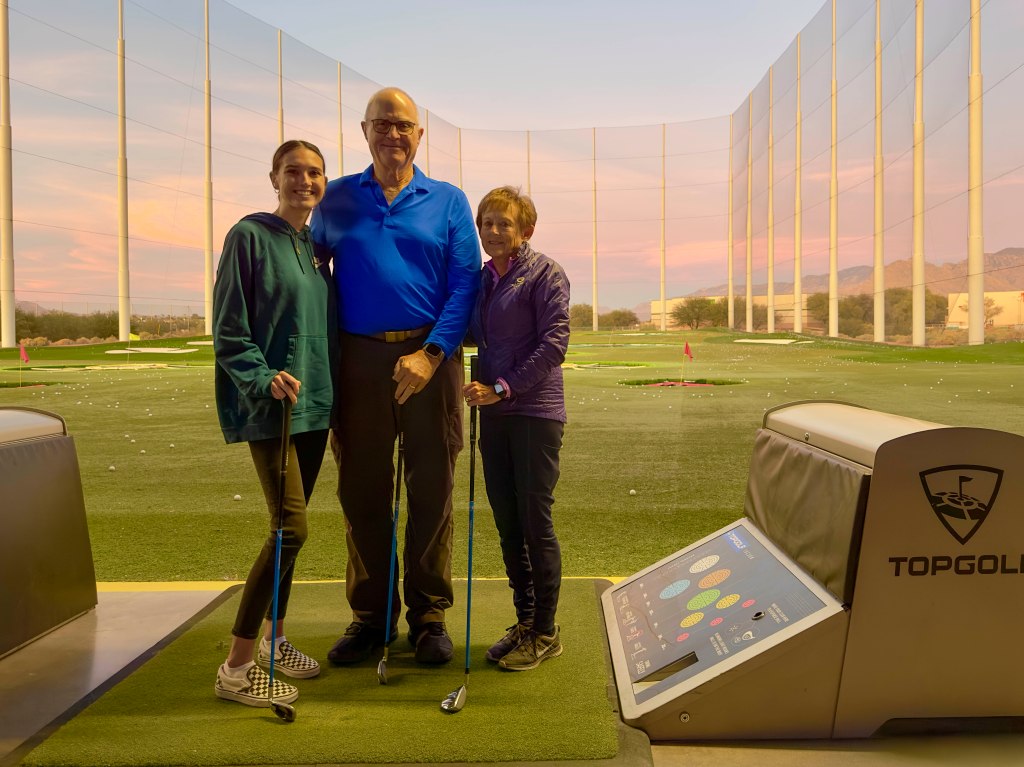 Suddenly – birthdays and holidays hit. First up was E’s b-day, which was celebrated with niece Demi in Tucson. She played to our interest and treated to Top Golf. The evening skies were a beautiful backdrop – –