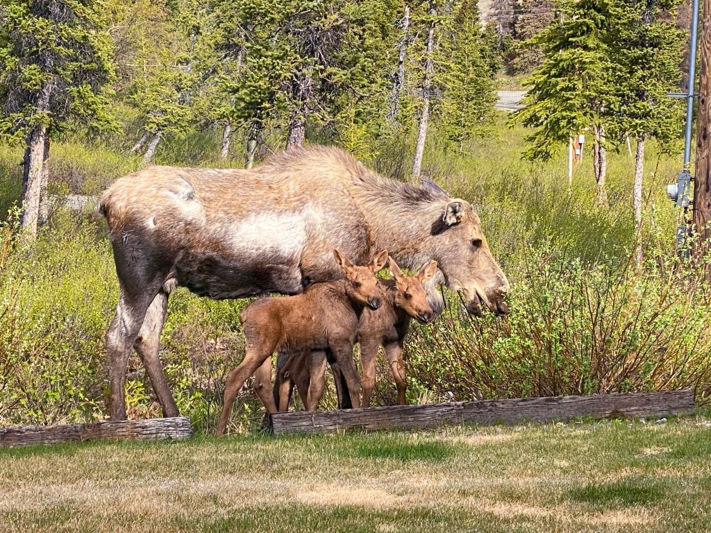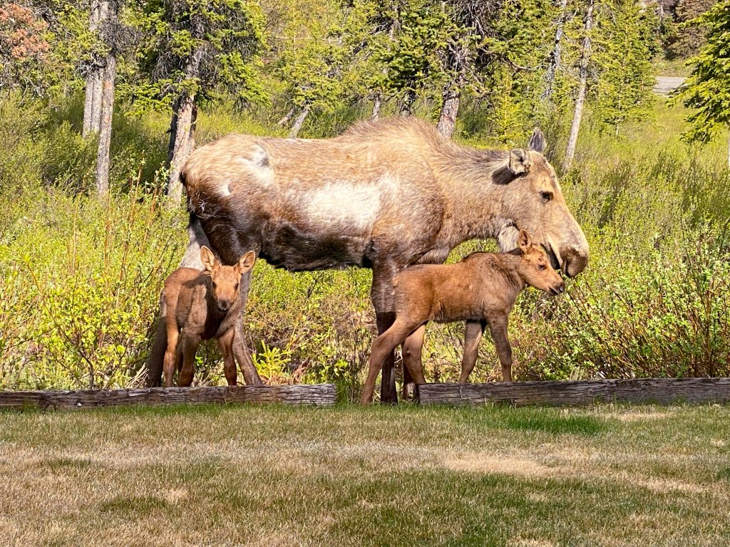 A good night sleep in our happy home was needed before a VERY early wake-up call for the bus into the park. Morning called with Mama Moose and her two calves RIGHT OUTSIDE OUR WINDOW. How perfect was that!?! According to the information on the park ride, females had just dropped their calves within the last two weeks – so these two must have been 10-14 days old.