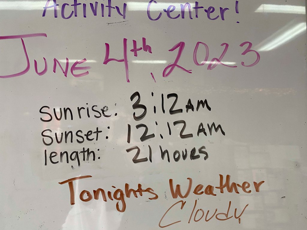 So – the BIG event – drum roll please. Off to the Arctic Circle, landing in Coldfoot and visiting Wiseman, the village of 12! The plane departs at 6:15, but that won’t be a problem as sunset (sort of) isn’t until 12:12!!