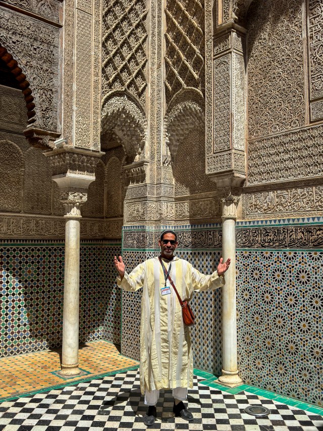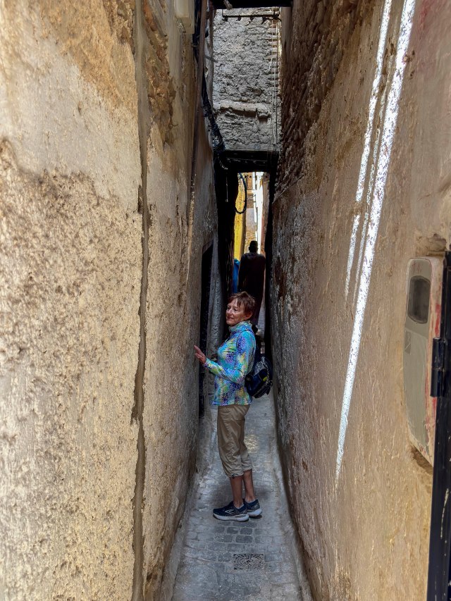 The oldest continually operating university in the world (established in 859) is just around the corner – the Karaouiyine Mosque. It was founded by Fatima bint Mohammed el-Fihri, a religious WOMAN who donated her worldly riches for its construction. Its prayer hall can hold up to 20,000 people but it is so wedged into the Medina it is impossible to tell its size. And, since it is a mosque, it is closed to non-Muslims so a picture of the doors and a very little glimpse of the interior is all one gets😢