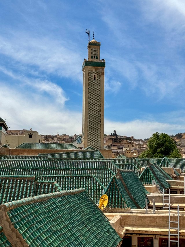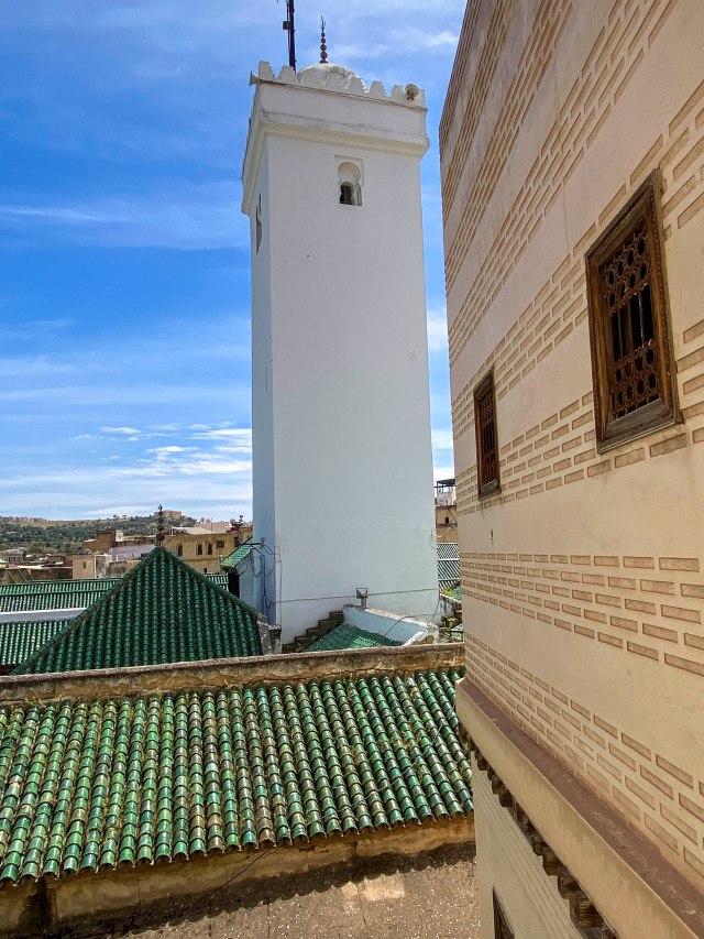 The green minaret is the Bou Inania Medersa, the green dome top is the tomb of Moulay Idriss and the white minaret is the oldest university!