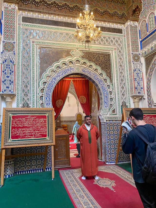 Now to that most venerated shrine promised in the introduction. The tomb of Moulay Idriss II (thought to be the founder of Fes) is that shrine. It was built in the center of the city at the beginning of the 18th century. It’s pyramid green dome that covers the tomb and its polychrome minaret give it a majestic silhouette and is quite noticeable in the skyline. Like the Medersa, every square inch is decorated. Unfortunately, this is closed to non-Muslims but photos from the door are allowed.