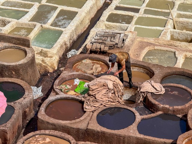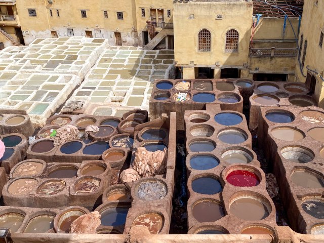 Vats at the leather tannery. Upper left white vats are pigeon s&$@t to ‘strip’ the hides of hair, etc.