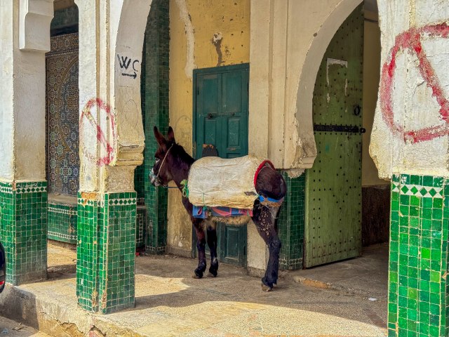 The drive to Volubilis from Fes is about 3 hours if one stops to enjoy the fabulous scenery of green fields and wildflowers and boys on decorated donkeys!