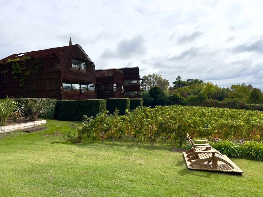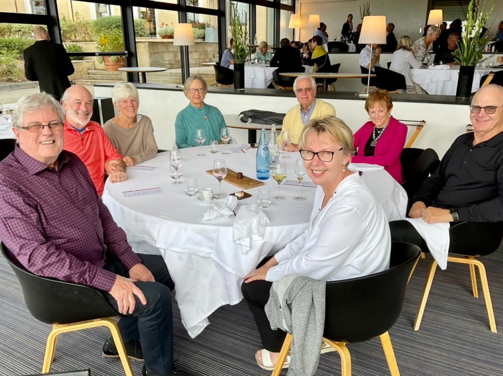 Awards galore. Beautiful grounds. Our restaurant is on the lower right.Our happy – very full – table mates. A couple of the courses.