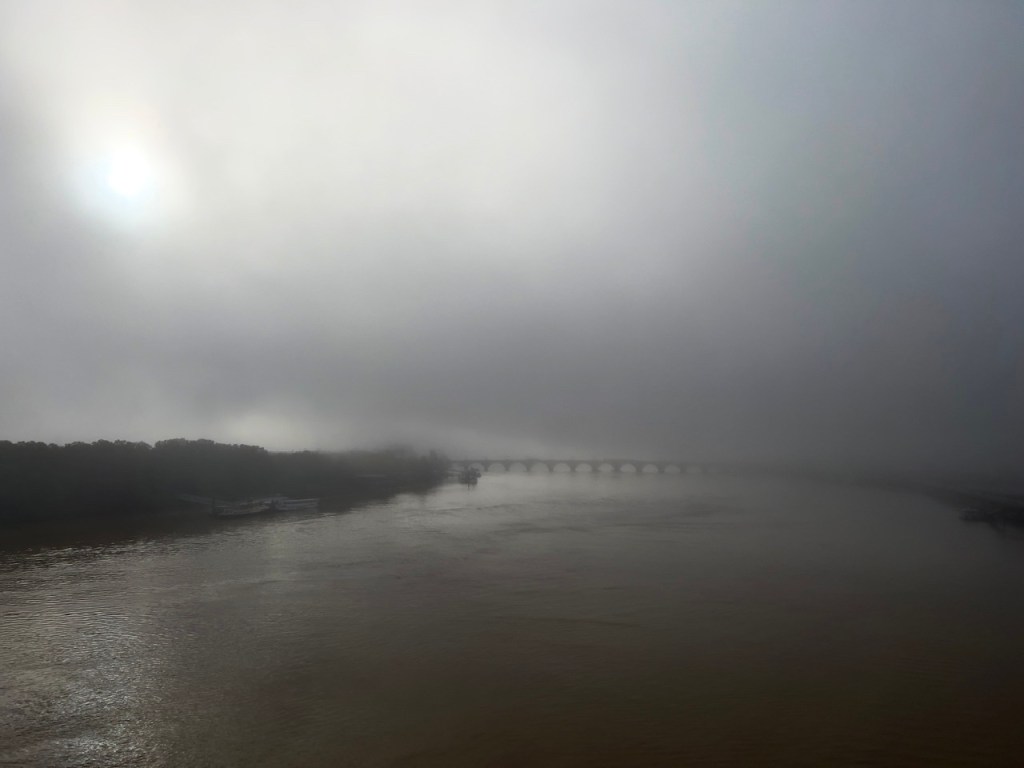 Morning sun trying to break through the river fog – –– – And then there was blue sky and a fabulous view of Bordeaux from our balcony.Our ship is moored on the Garonne River in the middle of the city.