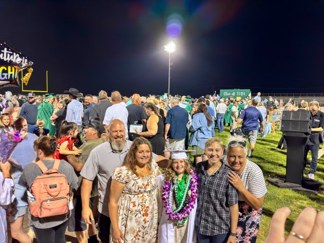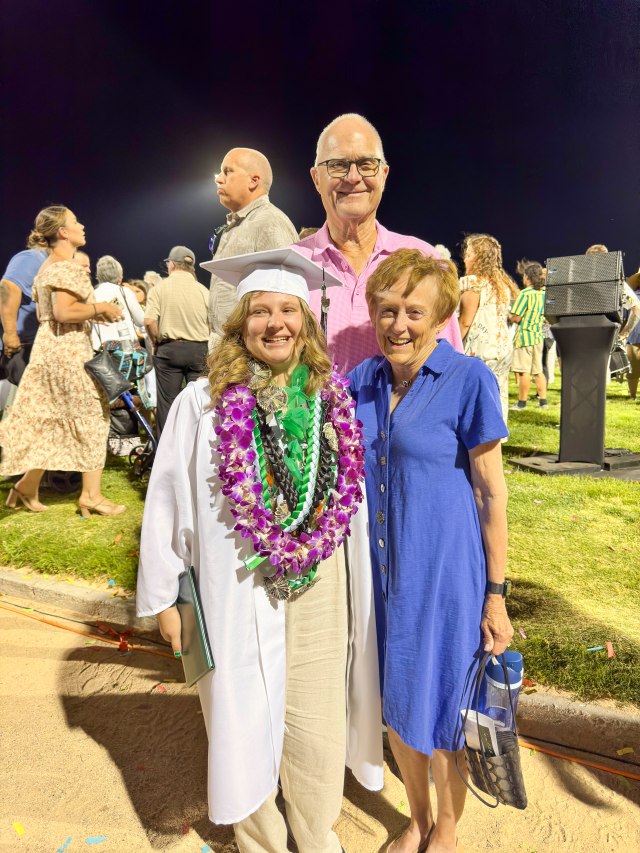 With barely enough time to turn around, it was the end of May and time for another graduation. Granddaughter Olivia was excited for that high school passing and entrance to many new experiences. Thank goodness the graduation class was a mere 350 students, so the evening went much quicker than the U of A ceremonies;-) AND – where but a school next to a Navy base would one have a fly over for a high school graduation?!?!