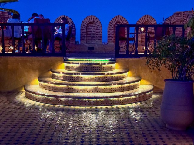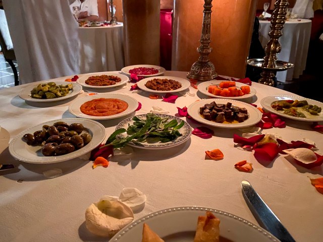 The destination is an old riad that has been beautifully redone – all the way to the rooftop bar which overlooks Marrakech.  This is the first stop for the evening to relax and enjoy a drink with a view.  Don’t hurry!  You will be escorted to your table – covered in flower pedals – when the time is right.