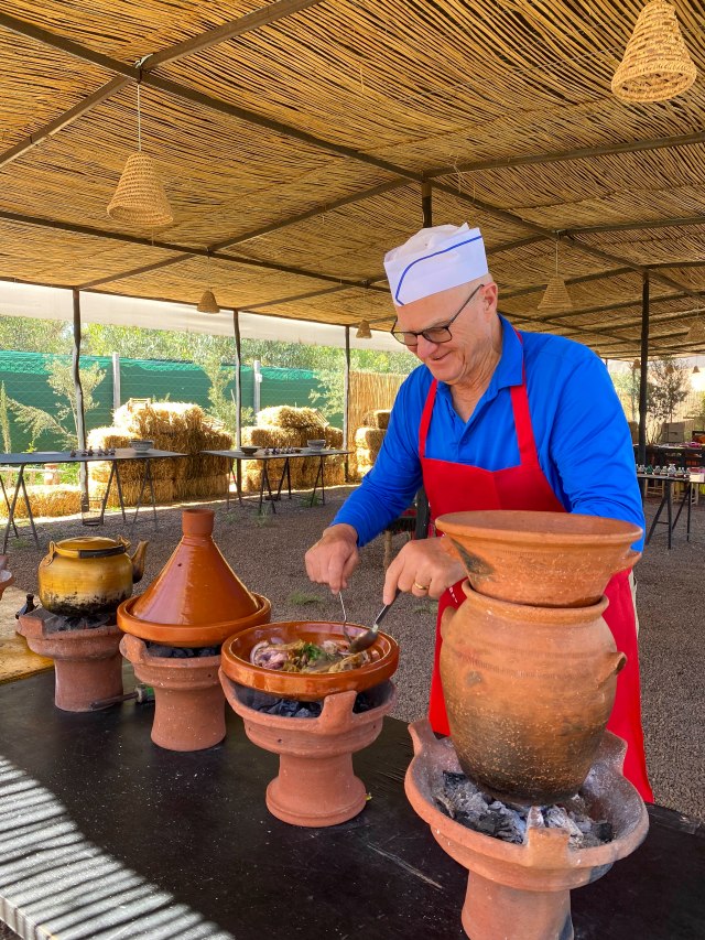 The lamb tajine is started first, as it takes the longest to ‘simmer’.  It is followed by the chicken tajine and then the couscous.  (Notice all the cooked dishes are done over charcoal fires.  This is done in the homes also, as electricity is very expensive. We’ll experience this at the next stop.) In between, the carrot and zucchini salads are prepared even leaving time for a tour of the grounds.