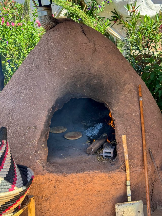 The making of this bread – in this traditional manner – is NOT done just for us.  The women in this and surrounding villages do this daily making enough for their family for all three meals every morning.  It is done in these ‘ovens’ with wood fires as electricity is too expensive.  Almost all cooking is done with similar fires – as all tajines, etc.