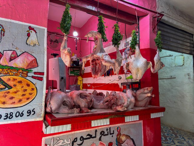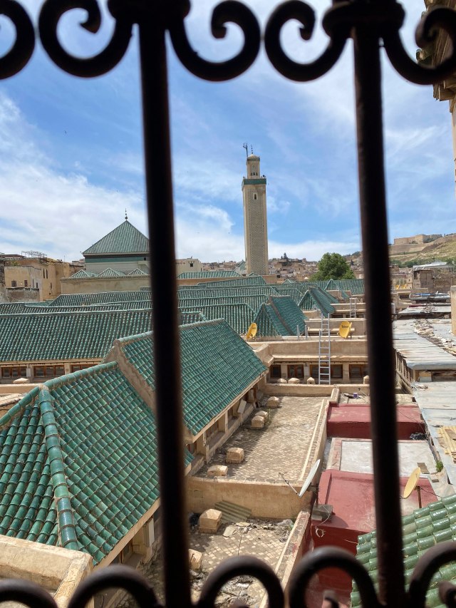 The oldest continually operating university in the world (established in 859) is just around the corner – the Karaouiyine Mosque.  It was founded by Fatima bint Mohammed el-Fihri, a religious WOMAN who donated her worldly riches for its construction.  Its prayer hall can hold up to 20,000 people but it is so wedged into the Medina it is impossible to tell its size.  And, since it is a mosque, it is closed to non-Muslims so a picture of the doors and a very little glimpse of the interior is all one gets😢