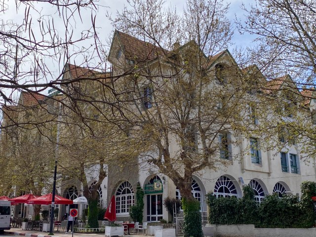 The beautiful grounds inside with the dining area on the right upstairs with the windows.