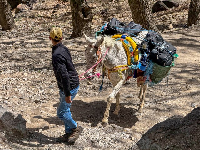 A great suggestion here is Kasbah du Toubkal – an imposing fort (Kasbah) on the slopes below the peak.  “Check-in” at the village reception in town in order to get a mule to carry your luggage and to be sure the gate is unlocked when you arrive.  Then – start your trek – –
