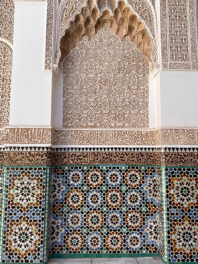 Now it was time to get serious.  Bou Inania Medersa is a very large, sumptuously decorated medersa constructed between 1350 and 1355 by the Sultan Abou Inan.  It is a mosque, school and students’ residence.  The fact that it has a minbar (pulpit) and minaret indicates that the sultan wanted this to be more than just a theological college – he wanted it to rival the most important mosque in the city.  While the plan of the building is simple – a square courtyard flanked by two halls and a large prayer hall – every surface is covered with decoration.  The floor is marble and the walls have three decorative bands always in the same order around the entire floor – geometric tile work below, script carved into tiles and then carved stucco work to the ceiling.  The ceiling is carved cedar wood and/or mosaics.